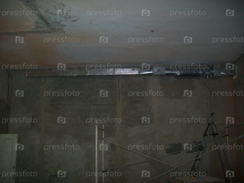 Строительство системы вентиляции в помещении с серыми стенами и рамками во время реконструкции здания
