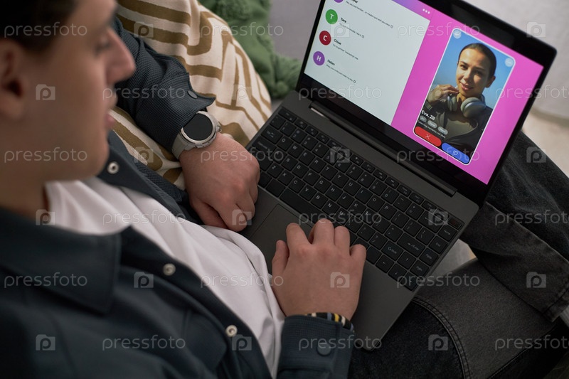 Молодой человек использует ноутбук для онлайн-знакомств Видеочат в домашних условиях