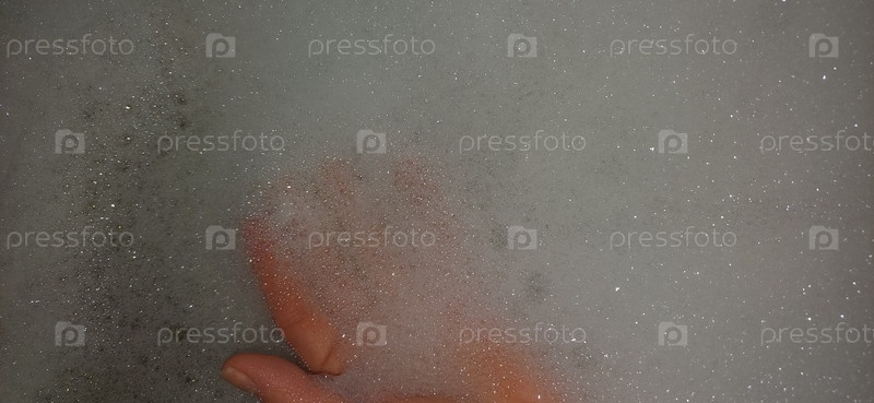 Мягкие пузыри создают расслабляющую атмосферу в теплой ванне с руками, нежно играющими в пену