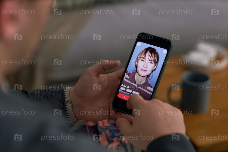 Молодой взрослый мужчина использует приложение знакомств на смартфоне, сидя в помещении