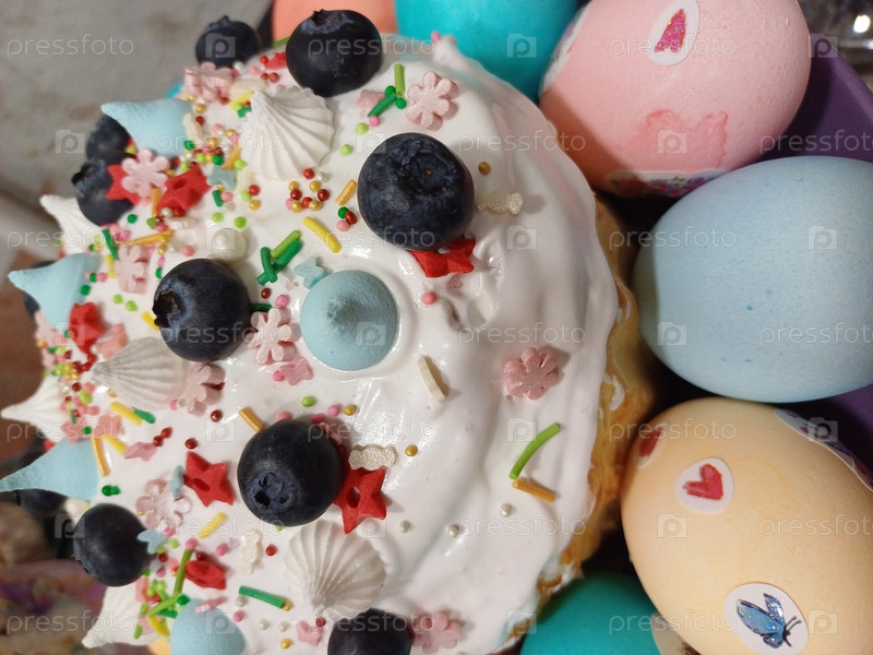 Красочный торт, украшенный чернилами и пасхальными яйцами, выставлен на праздничном столе во время весенних каникул