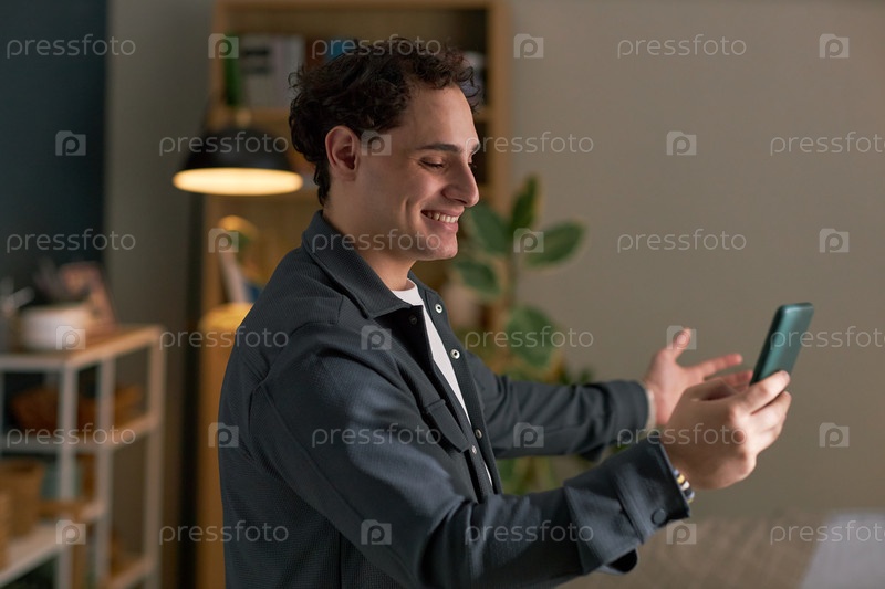 Молодой взрослый мужчина улыбается во время видеочата во время онлайн-знакомств