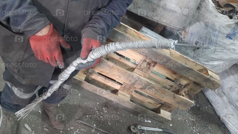 Рабочий формирует стальные провода в мастерской днем возле деревянных поддонов