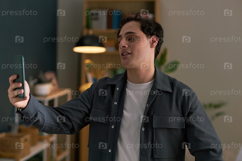 Молодой взрослый мужчина держит смартфон, улыбаясь во время онлайн-знакомств