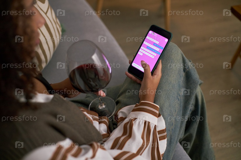 Молодая взрослая чернокожая женщина общается на приложении для знакомств, держа стакан вина