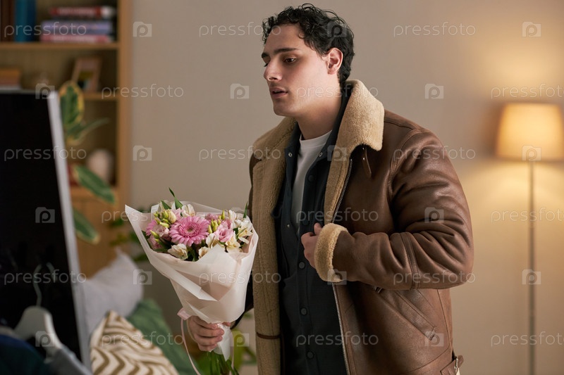 Молодой взрослый мужчина держит букет, готовящийся к романтическому свиданию в помещении