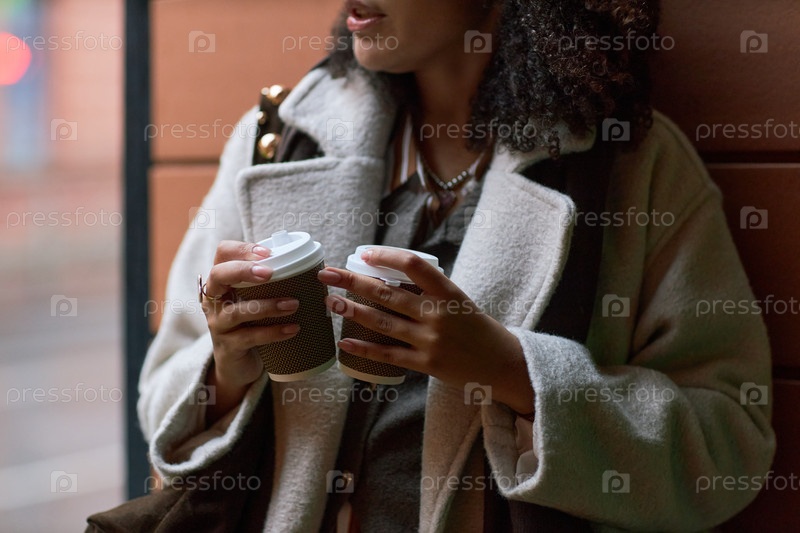 Молодая взрослая чернокожая женщина держит две чашки кофе в ожидании свидания