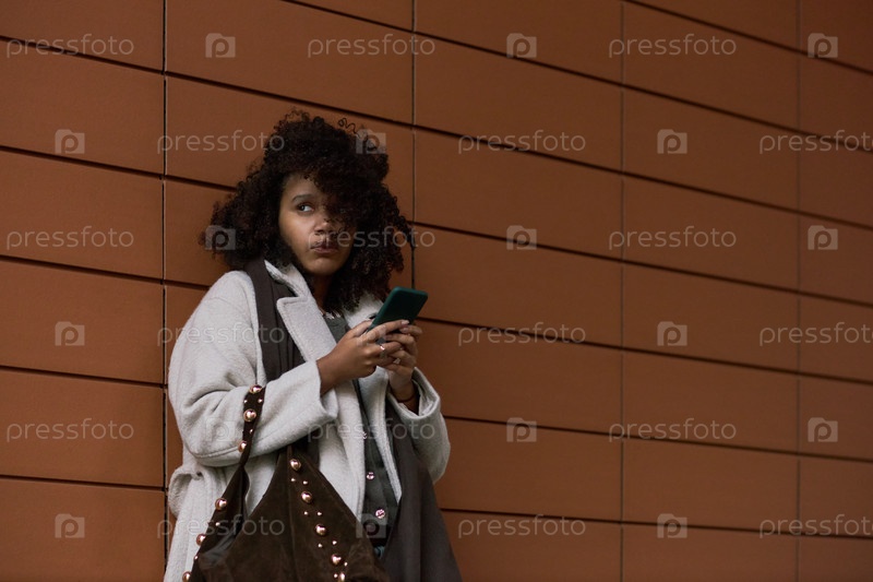 Молодая взрослая черная женщина ждет и использует смартфон для онлайн-знакомств
