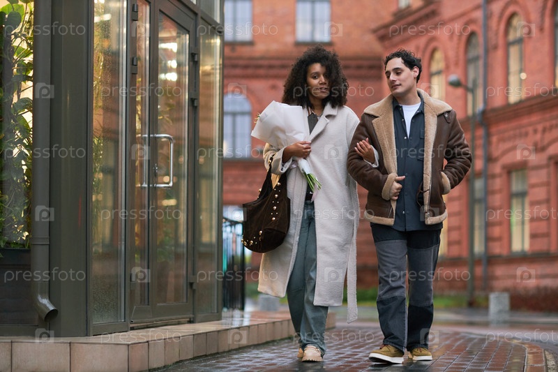 Молодой взрослый мужчина и чернокожая женщина ходят вместе на романтическом свидании