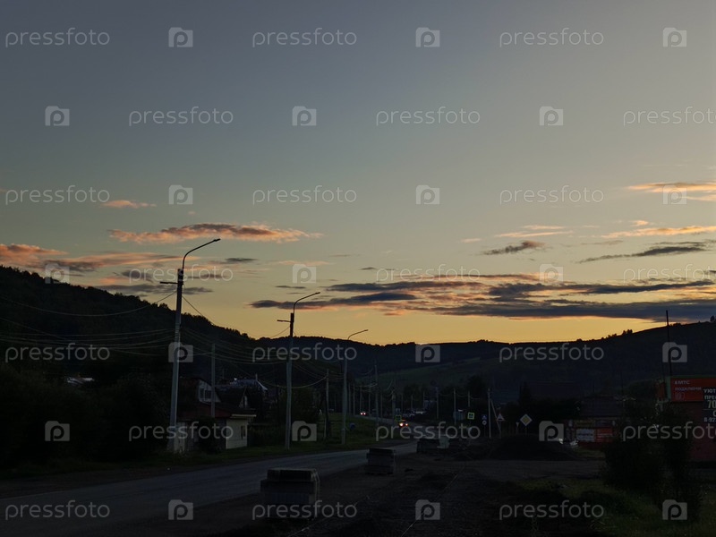 Вид на закат над холмами с дорогой и облаками в небе возле небольшого городка при вечернем свете