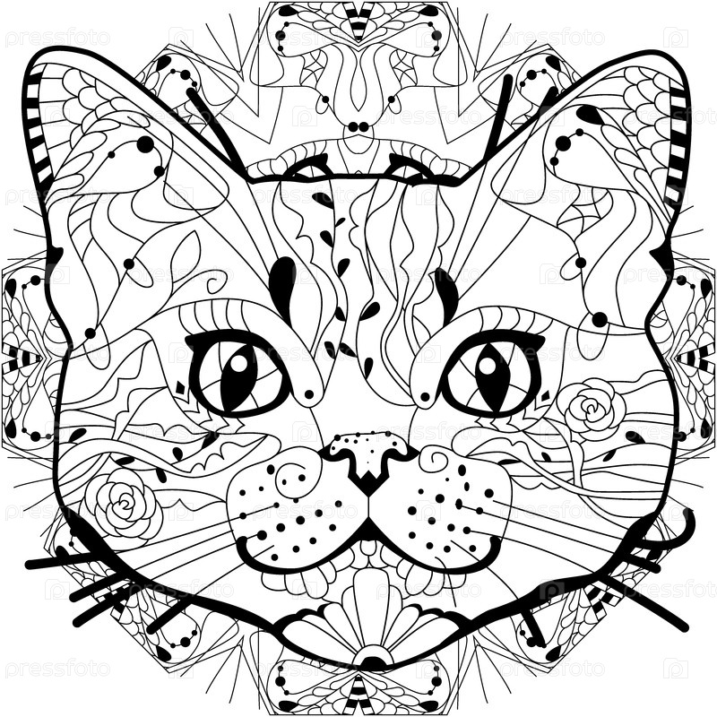 Стилизованная голова кошки на мандале для окрашивания книги