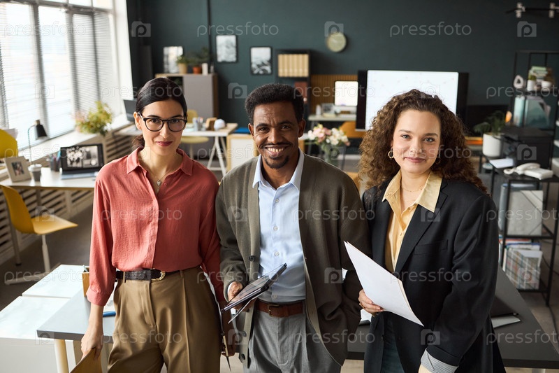 Портрет многонациональных молодых коллег-взрослых, улыбающихся в современном офисе