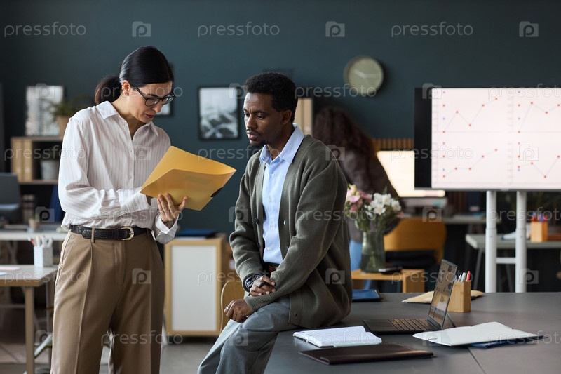 Женщина объясняет финансовый отчет молодому чернокожему человеку в офисе