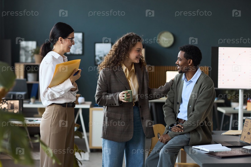 Молодая женщина приветствует молодого чернокожего мужчину, улыбаясь в офисе