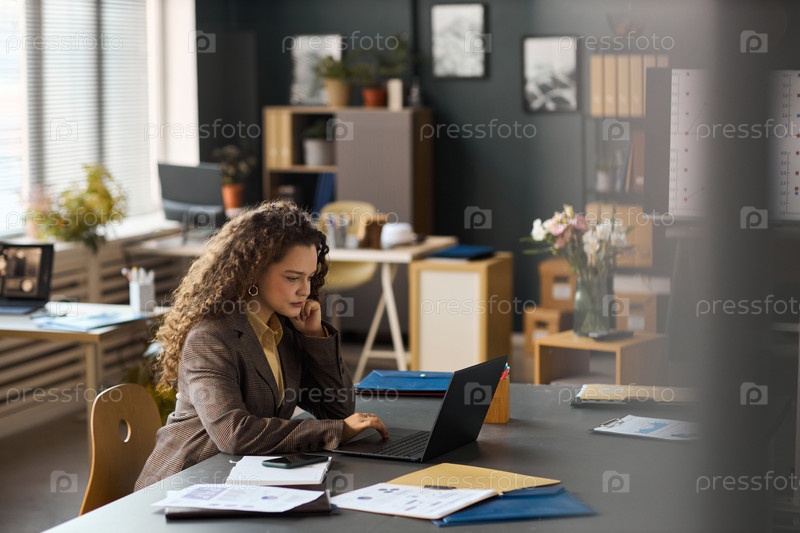 Молодая взрослая женщина концентрируется, печатая на ноутбуке в офисе
