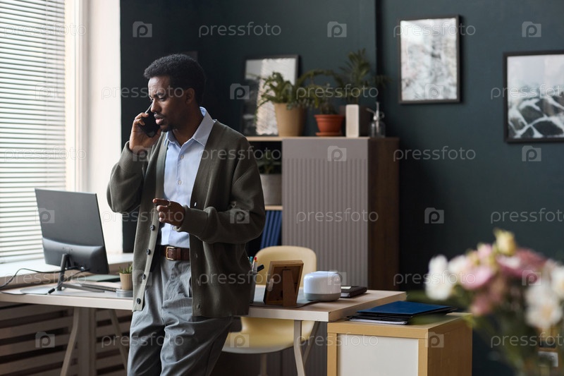 Черный мужчина разговаривает со смартфоном, стоя в современном офисе