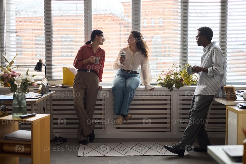 Молодые многонациональные коллеги общаются и пьют кофе в современном офисе