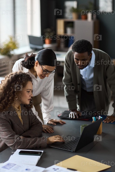 Три человека сотрудничают вокруг ноутбука во время офисной встречи