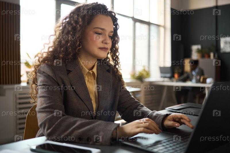 Молодая взрослая женщина сосредотачивается на ноутбуке, работая в ярком офисе