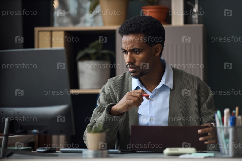Молодой взрослый чернокожий мужчина работает за рабочим столом, используя компьютер в современном офисе