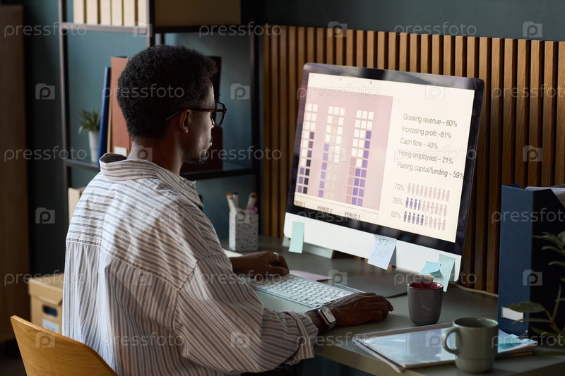 Черный человек анализирует бизнес-данные на компьютерном мониторе за рабочим столом