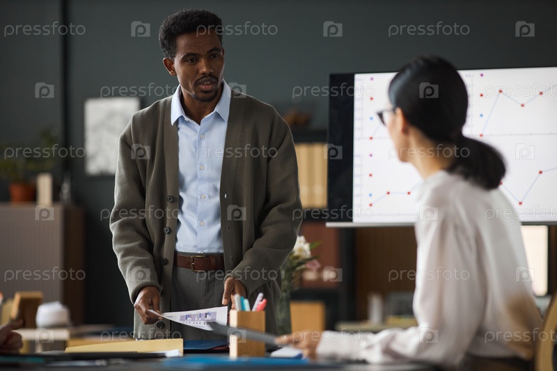 Чернокожий мужчина представляет деловой отчет молодой женщине