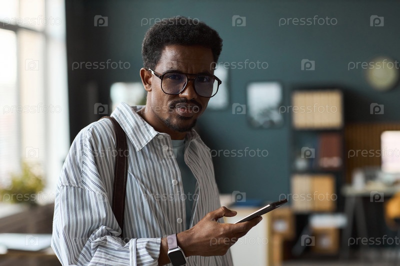 Портрет молодого взрослого чернокожего мужчины, носящего очки и использующего смартфон в помещении