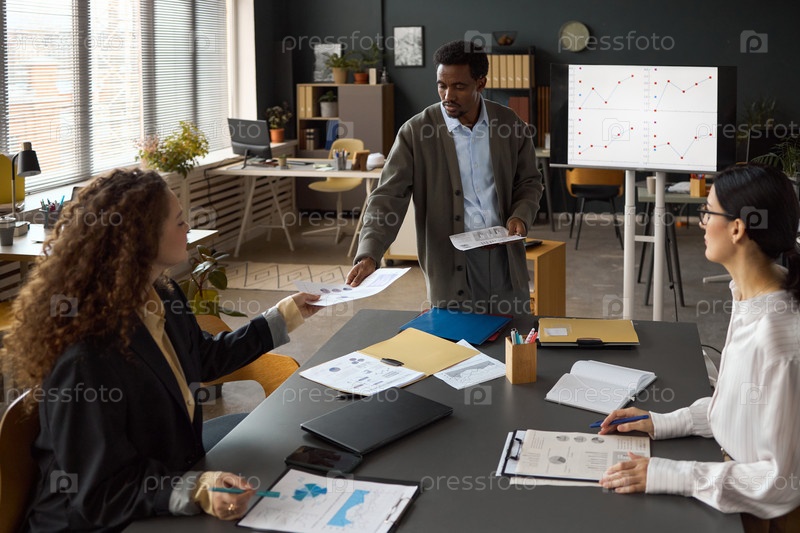 Молодой взрослый чернокожий мужчина возглавляет деловую встречу с различными коллегами, сотрудничающими