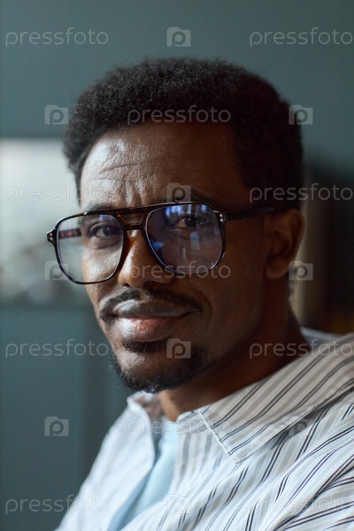Портрет чернокожего человека, улыбающегося и смотрящего на камеру в помещении