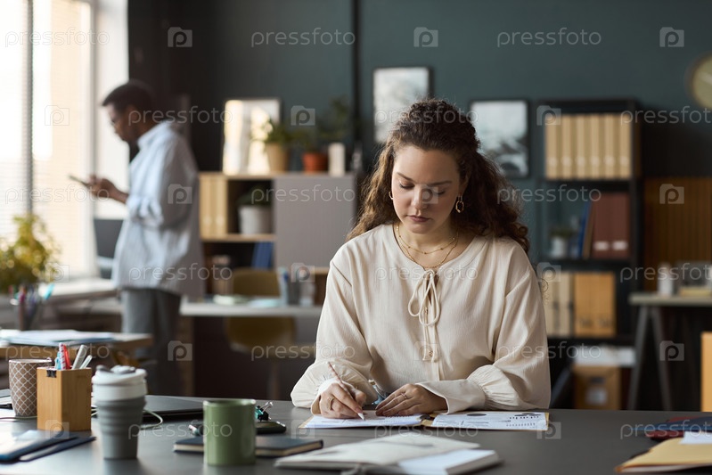 Молодая женщина пишет заметки на столе в современной офисной среде