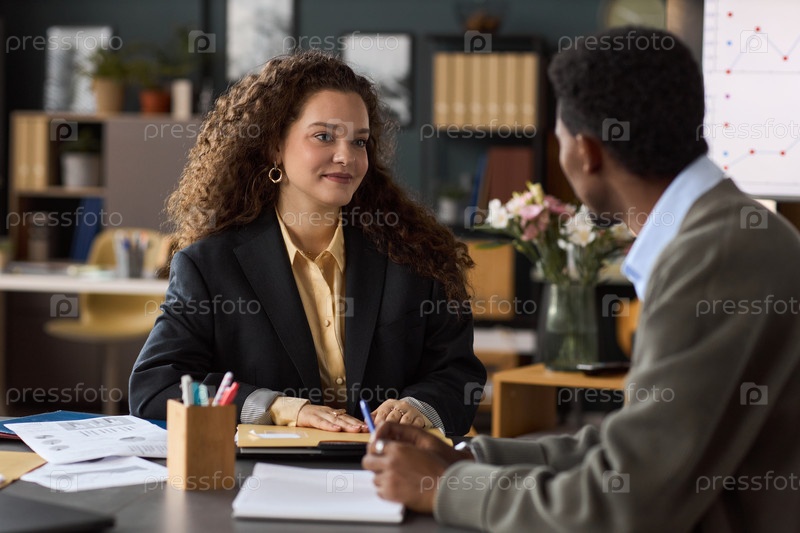 Молодая женщина слушает чёрного мужчину во время деловой встречи