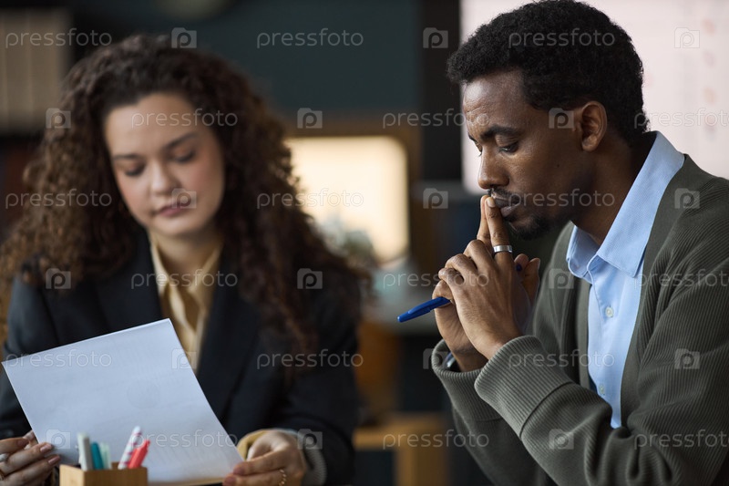 Черный мужчина слушает женщину, объясняющую документальный фильм