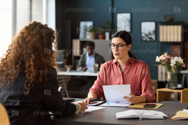 Молодая взрослая женщина обсуждает документы с коллегой в офисе