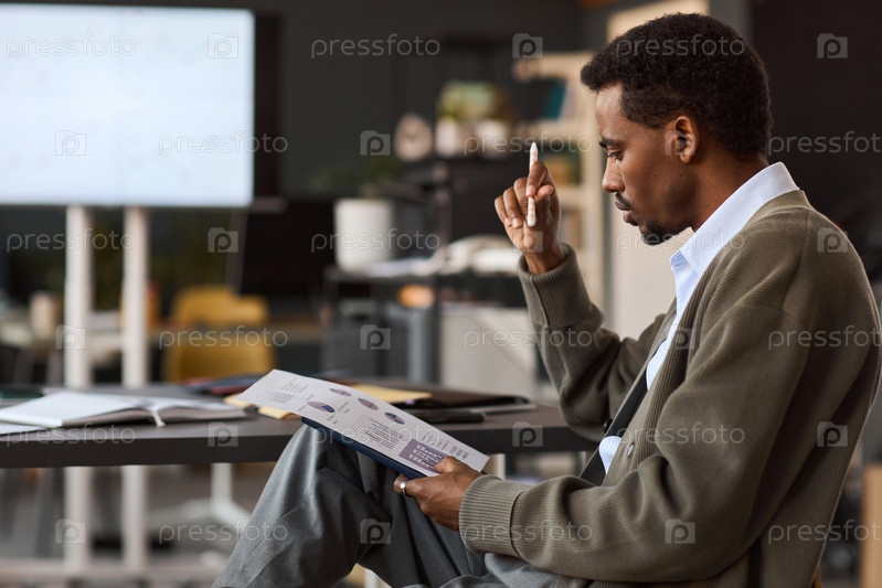 Молодой взрослый чернокожий мужчина анализирует финансовый отчет во время деловой встречи