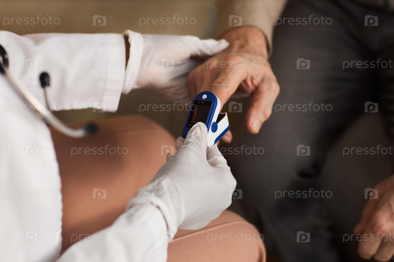Старший мужчина с уровнем кислорода в крови, проверенным женщиной-врачом