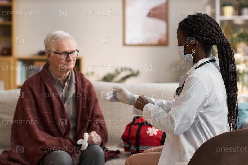 Чернокожая женщина-врач среднего возраста готовится к осмотру старшего мужчины