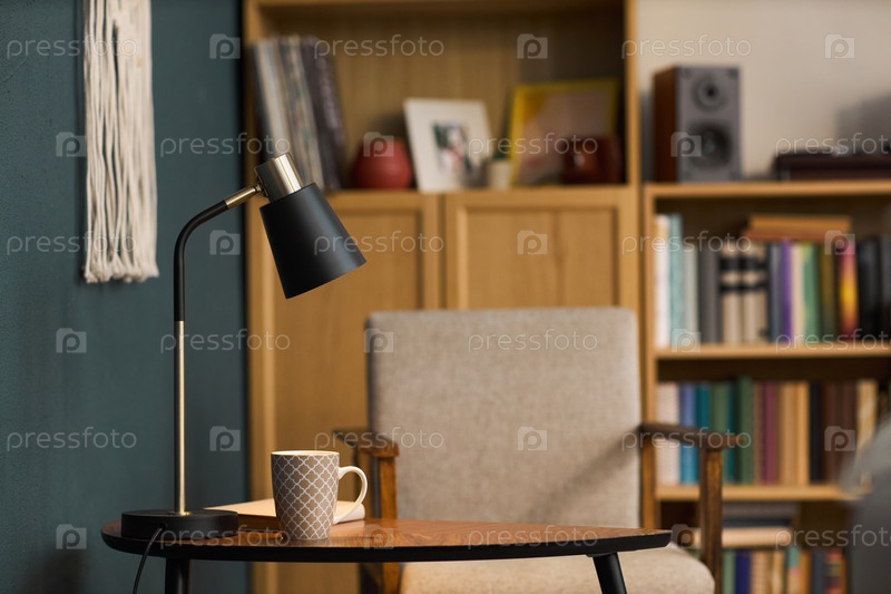 Современная настольная лампа освещает уютную гостиную с книжной полкой на заднем плане