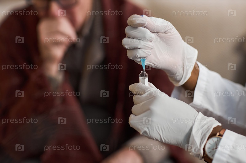 Мужчина смотрит на медицинского работника, готовящего инъекцию вакцины