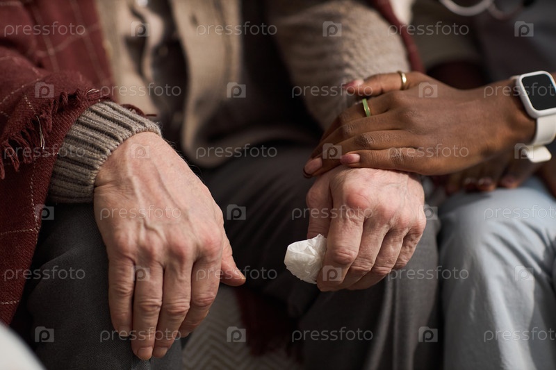 Старший мужчина утешается молодой чернокожей женщиной, предлагающей эмоциональную поддержку