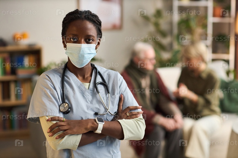 Портрет молодой чернокожей медсестры с маской, стоящей в доме престарелых пациентов