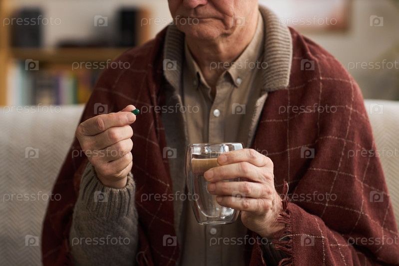 Пожилой мужчина принимает лекарства, сидя в помещении и держа стакан