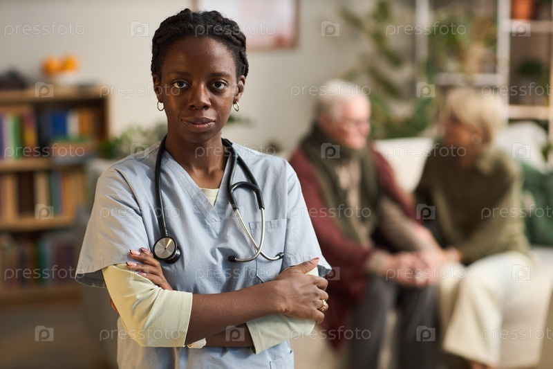 Портрет молодой чернокожей медсестры, уверенно стоящей в доме больного