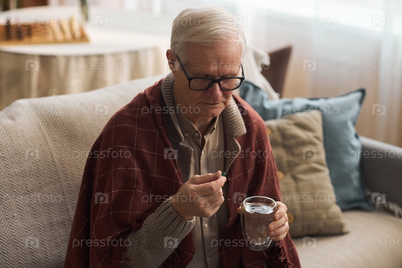 Пожилой мужчина принимает лекарства, сидя на диване дома
