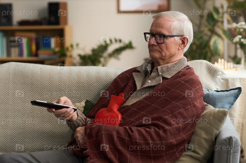 Старший мужчина сидит на диване, смотрит телевизор и держит бутылку с горячей водой