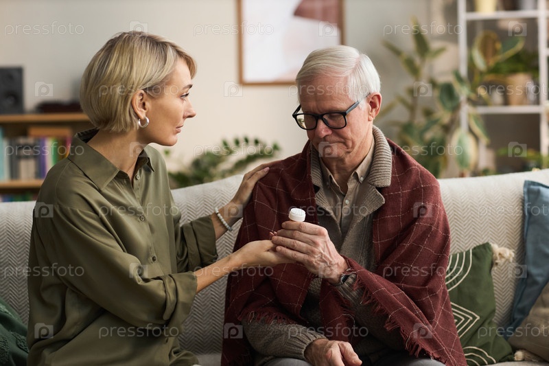 Женщина среднего возраста помогает пожилому мужчине принимать лекарства