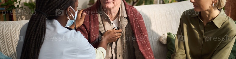 Мужчина получает медицинский осмотр от чернокожей медсестры на дому