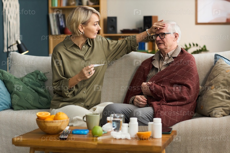 Женщина среднего возраста проверяет температуру старшего мужчины