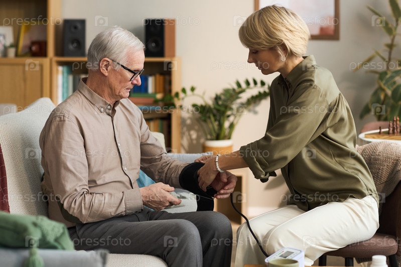 Женщина среднего возраста измеряет кровяное давление пожилого мужчины
