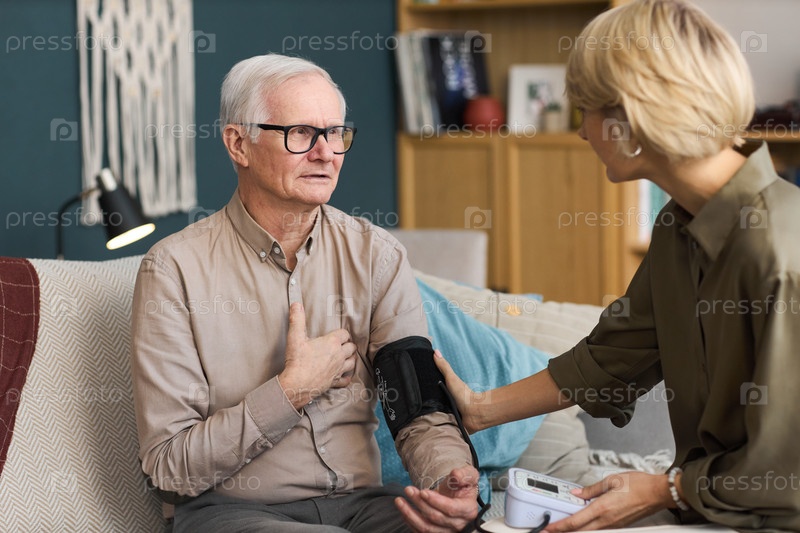Старший мужчина сидит, пока медсестра измеряет кровяное давление дома