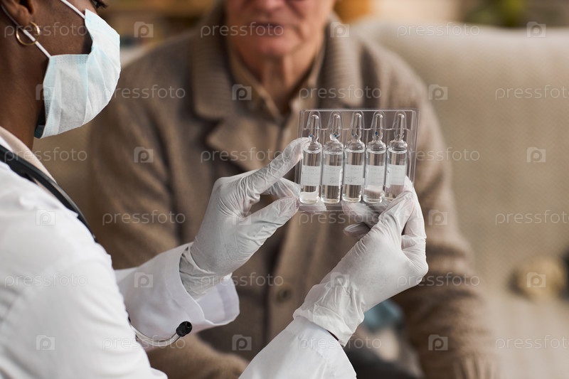 Чернокожая медицинская работница показывает ампулы вакцин старшему мужчине